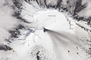 Explore Veniaminof volcano activity as it remains active with ash plume and small lava flows in Alaska's Aleutian arc.