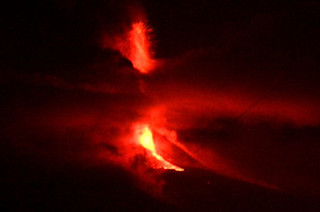 You can check out video of the event from BBC - in it you'll see the impressive fire fountains from the vent during the eruption, some as tall as 600-800 meters! (see above). Eruptions reader GeoRaving posted this little animated GIF of the eruption from a webcam set a distance from Etna - you can clearly see the lava flow extruding from the volcano. You can see more of the explosive nature of the eruption in some of these images by Marco Restivo. The viewers at home can keep an eye on the activity at Etna by looking at the variety of Etna webcams (see the great capture image below) - from INGV Catania and Etna Trekking. You can also watch the live tremor for Etna to look for the signs that an eruption might be in the works.