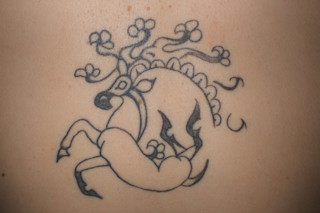 "I thought I'd send you a photo of my tattoo. I guess it fits into the 'anthropology' category although I'm actually a vet (I've seen exactly one deer in a professional capacity since I graduated). It's a copy of a tattoo found on the Pazyryk mummy, a 2,400 year old Scythian, possibly a shaman. I've heard that it's the oldest known tattoo found on a woman, but I'm not sure whether that's correct. It was done to celebrate the end of a 1, 200 mile walk from John O Groats to Land's End back in 2002. I've heard of other people with it, but haven't seen any, so I'd be interested to find out if any of your other readers have the same one. Not as cool as some, but I like it!"