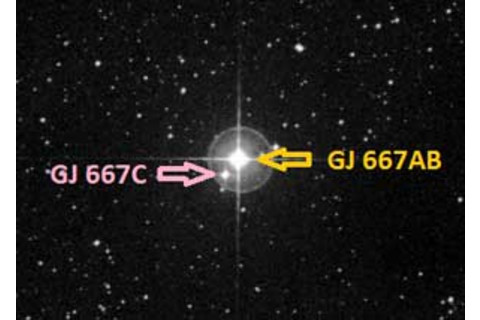 In this case, the spectrum reveals GJ 667C may have four planets! Two very strong signals pop up with periods of 7 and 28 days, a third one at 75 days, and a possible trending shift in the spectrum that may point to a planet orbiting in a very roughly 20 year period. It's that second planet, GJ 667C with a 28 day orbit that's so interesting. Its mass is at least 4.5 times that of the Earth, so it's hefty. A 28 day orbit puts it pretty close to the parent star -- about 7 million kilometers, or less than 5 million miles (Mercury is 57 million km from the Sun, by comparison). But remember, GJ 667C is a very dim bulb, so being that close means that the planet is actually right in the middle of the star's habitable zone! The HZ is the distance where liquid water could exist on a planet -- it depends on the size and temperature of a star, and also on the planet's characteristics. A cloudy planet can hold heat better through the greenhouse effect, so it can be farther from the star and still be warm, for example. So this planet, if it's rocky, might have liquid water! Of course, we know nothing about the planet itself except its mass, and even that's a lower limit, due to the physics of how it's measured based on the star's spectrum. Still, we can use that number and play a bit. You might think that mass gives it a crushingly higher gravity than Earth. But wait! The gravity you feel standing on the surface of a planet does depend on its mass -- double the mass and you double the gravity -- but it also depends on the inverse square of its size. So if you keep it the same mass but double the radius, the gravity drops by a factor of 4. So if GJ 667Cc has 4.5 times the Earth's mass, but is twice as big, the gravity on the surface could be quite close to ours. My point: don't judge a planet by its mass until you know its girth. Of course, we don't know if this planet has an atmosphere or anything like that, either. It seems likely; it should have enough gravity to hold onto some gases. And if it does have an atmosphere, we don't know if it has water or anything like that. So there are a lot of unknowns here (which is why I warned you not to get too excited up front), but even so, there's some reason to be hopeful. Why? Two reasons. One is that these dinky red dwarf stars are by far the most numerous in the galaxy. They outnumber stars like the Sun by nearly 10 to 1. So if this one has a planet -- and in a triple system! -- then it's likely that planets are extremely common in the galaxy. We're getting that from lots of different studies, but it's nice to see that fall into line here, too. Second, remember, it's close by (not that we'll be heading there any time soon, but still). 20 light years is nothing compared to he 100,000 light year diameter of our galaxy. Just by random chance, having a planet even remotely Earthlike at that distance implies there are billions more in our galaxy alone! Third, these stars are deficient in heavy elements. The spectrum of GJ 667C reveals it has far less things like oxygen and iron in it than the Sun does. Studies have shown that stars like this are less likely to have planets than stars like the Sun, which are rich in there elements. Maybe we got lucky that a nearby deficient star has planets, or maybe the earlier work is off a bit and stars like this do have planets. Either way, it again implies planets are extremely abundant in the galaxy. So no matter how you look at it, this is good news. And it's one step closer to the big goal of exoplanet astronomy: finding another Earth. That day is approaching. Maybe even soon. Image credits: G. Anglada-Escudé using the program Celestia; G. Anglada-Escudé/DSS.