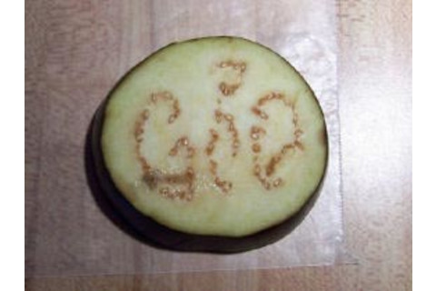 Looking at this one, at first it appears to pretty good! But then I looked at it more, and realized the G is actually more like a C. The bottom part curls in to make it G-like, but the top curls in too, thus rendering it categorically not-G. Of course, cod is a fish, and a fish is a symbol of Christ. See? Even I can connect the dots seeds. Also, in the video on the site linked, she flips the slice over, and a horned head is clearly seen. The flip side of God? Or a martian invader? And what's with the second O above the middle O? COOD? GOOD? Are eggplants GOOD? I actually don't like them, so that interpretation is obviously wrong. The last letter looks like a D, but could also easily be a P... OH NOES! It spells GOP. Eggplants: