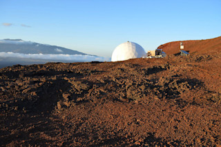 The HI-SEAS dome sitting atop its perch on the volcano Mauna Lua in Hawaii. (Courtesy HI-SEAS.org) There are very few people that would balk at the chance to spend four months in Hawaii. But let’s say you had to pass those four months shacked up in a 1,000-square-foot dome, shoulder-to-shoulder with five strangers who are only allotted eight minutes of shower time — a week. And, lest we forget, the only way you’ll enjoy the Hawaiian sunshine is by donning a frumpy, awkward simulation space suit each time you step outdoors. Still want in? Well, that’s the fate that awaits the six-member crew of NASA’s second HI-SEAS mission, which is meant to replicate, as closely as possible, what it would be like to live on Mars. The HI-SEAS simulator is built on jagged lava rocks 8,200 feet above sea level on the Mauna Loa volcano. It’s a desolate place that closely resembles the terrain of Mars. Three male and three female researchers officially began their four-month stay in the geodesic habitat on March 28. NASA plans to study how living in cramped quarters for an extended period of time changes crew members’ emotional and psychological state. The findings will offer a glimpse into the mental toll that a two-and-a-half-year manned mission to Mars — planned for around 2030 — might have on humans.
