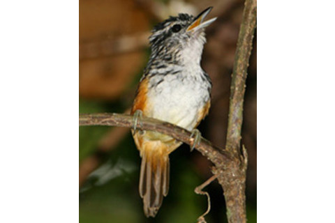 Joseph Tobias and Nathalie Sneddon uncovered this complicated sonic rivalry by recording 27 pairs of wild warbling antbirds in their natural environment in Peru. Males and females sing different tunes and their duets consist of a regular series of couplets - the male always leads and the female chimes in immediately after. These couplets require split-second timing. If she comes in any earlier, the female interferes with the male's song.