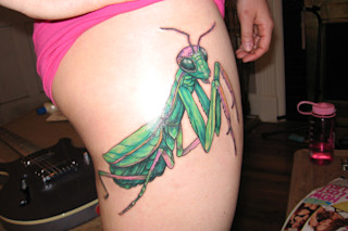 I am a soil scientist and entomologist. My favorite insects/arthropods are praying mantises, psuedoscorpions and spiders. I am also a big time feminist. I find praying mantises to be so fascinating, and while they are extremely adept killing machines, they are also one of the oldest insects around! This tattoo is a metaphor for my independance and tribute to my mantis friends.From Wikipedia: Sexual cannibalism is common among mantids in captivity, and under some circumstances may also be observed in the field. The female may start feeding by biting off the male's head (as with any prey), and if mating had begun, the male's movements may become even more vigorous in its delivery of sperm. Early researchers thought that because copulatory movement is controlled by ganglion in the abdomen, not the head, removal of the male's head was a reproductive strategy by females to enhance fertilisation while obtaining sustenance. Later, this bizarre behaviour appeared to be an artifact of intrusive laboratory observation. Whether the behaviour in the field is natural, or also the result of distractions caused by the human observer, remains controversial. Mantises are highly visual creatures, and notice any disturbance occurring in the laboratory or field such as bright lights or moving scientists. Research by Liske and Davis (1987) and others found (e.g. using video recorders in vacant rooms) that Chinese mantises that had been fed ad libitum (so were not starving) actually displayed elaborate courtship behavior when left undisturbed. The male engages the female in courtship dance, to change her interest from feeding to mating. Courtship display has also been observed in other species, but it does not hold for all mantises.So in fact, the common assumption that all females cannabilize their mates either during/after copulation is debated because most observations of this were in a lab, where the mantis was likely highly aware of her captors. I have a magnet on my fridge with a woman in a wedding dress that says..."Marriage? No...I don't mate well in captivity!"