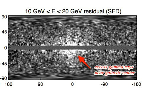 One of the secondary goals of the Fermi gamma ray satellite is to look for the signature of dark matter. One idea for dark matter is that it's composed of weird (and as yet undetected) particles called WIMPs (weakly interacting massive particles). A very odd property about them is that they are self-annihilating: when two of them touch, they turn into energy (and other, more easily detectable particles). When I first read about this several years ago I was pretty excited, because this is finally a testable hypothesis about dark matter.