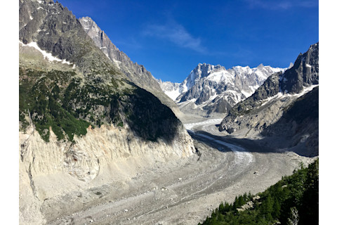 The Mer de Glace, or "Sea of Ice," is the best known part of the Mount Blanc Glacier in France. It has been receding rapidly for the past 30 years, now at a rate of about 15 feet each year. (Photo courtesy of Wendy Redal) The Earth has been cooling somewhat since the epic El Niño of 2015/2016. But even so, conditions are still plenty warm. The National Oceanic and Atmospheric Administration rates January through June of 2017 as the second warmest first half of any year since record-keeping began in 1880, behind the record year of 2016. The year-to-date temperature across global land and ocean surfaces was 1.64°F above the 20th century average of 56.3°F, according to NOAA. If that does not seem like very much, consider how miserable you feel when you spike a fever that's only a couple of degrees above normal. Or, for something directly connected to the warming of our planet, consider the photograph above, taken by my friend Wendy Redal during a trip to France in June. It shows the Mer de Glace, or "Sea of Ice," an extension of the Mont Blanc Glacier. Since 1850, the Mer de Glace has retreated by two kilometers, or 1.2 miles. You can see what that shrinkage looks like in this comparison: