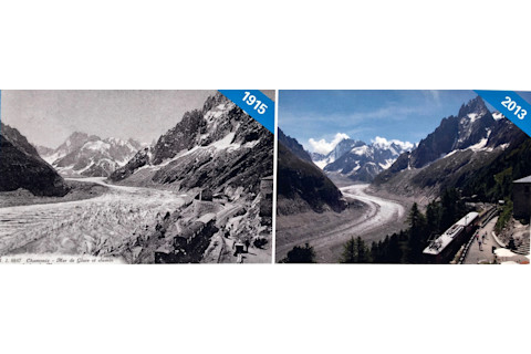 Comparison of the Mer de Glace, 1915 and 2013. (Source: Wendy Redal) As these comparison images show, the ice is not just retreating. It is also thinning — dramatically. In 1915, it was a short walk from the terrace visible in the lower right corner to the glacier. Since a new cable car system accessing the site was completed in 1988, engineers have had to add more than 400 steps to allow visitors to access the glacier.