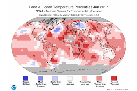 The June temperature across global land and ocean surfaces was 1.48°F above the 20th century average of 59.9°F. This was the third highest value for June in the 138-year period of record, behind 2016 and 2015. June 2017 marks the 41st consecutive June and the 390th consecutive month with temperatures at least nominally above the 20th century average.