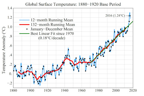 Here's how global surface temperature varied from the 1880 to 1920 base period, through June 2017. (Source: NASA GISTEMP & Makiko Sato, Columbia University) Month-to-month, and even year-to-year variations in global temperature aren't as meaningful as the trend over the course of decades. To see what that trend looks like, consider the graph above. It shows how temperatures have varied from a based period figured from 1880 to 1920. That base period allows us to get a sense of the magnitude of warming relative to pre-industrial time. (Since reliable temperature records are pretty sparse prior to 1880, the base period starts there.) Year to year, there is a great deal of variation — thanks to such natural factors as El Niño, which causes warming, and La Niña, which induces cooling. But the 132-month running mean, shown in red, smooths out those up and down spikes to provide a better sense of the long term picture. If you're wondering why 132 months was chosen, consider that this is 11 months — the length of a solar cycle, during which the energy output from the Sun cycles up and down. "The 11-year running mean does a pretty good job of taking out solar cycle variability and shorter-term variability such as the Southern Oscillation," according to an explanatory paper accompanying the graph. That red line explains very well what has happened to the Mer de Glace — why it looks so meager in the photograph by my friend Wendy compared to the image from 1915.