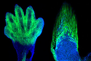 The same group of cells (highlighted in green) is responsible for creating digits in mice (left) and fin rays in fish (right). (Credit: Shubin Laboratory) Millions of years ago our ocean-dwelling ancestors stepped forth onto new shores and began populating Earth's dry land. Fossils such as Tiktaalik, one of the most compelling members of the class of transitional "lobe-finned fishes", mark the evolutionary path that led to land-bound animals. The transition from delicate fins to sturdy limbs didn't happen all at once, but it is clear that our appendages are distant cousins of fish fins. Using cutting-edge DNA mapping techniques, researchers from the University of Chicago have discovered fins and fingers emerge from the same group of embryonic cells, shedding light on how our earliest ancestors made landfall.