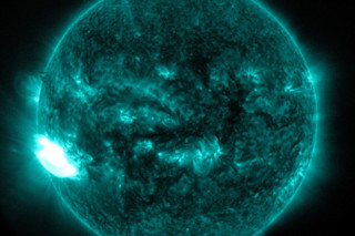 A solar flare erupts in this image captured by NASA's SDO spacecraft on Oct. 19, 2014. (Source: NASA/SDO) The Sun has been acting up lately, producing one powerful X-class flare and several more moderate flares over the past 72 hours. You can see the X-class flare exploding off the lower left aspect of the Sun in the false-color image above, which was captured by NASA's Solar Dynamics Observatory in the extreme ultraviolet wavelength of 131 Angstroms. This wavelength is ideal for seeing the intense heat of a flare. Earth's atmosphere and magnetic field protect us from solar eruptions that are pointed at us, but satellite operations can suffer varying degrees of disruption and even damage. And if an eruption is large enough, the results can be much, much worse. With the rise of solar activity over the past few days, minor geomagnetic storms may have occurred, according to the Space Weather Prediction Center. These are capable of producing weak fluctuations in power grids.