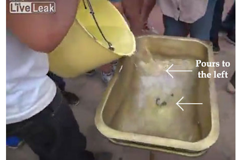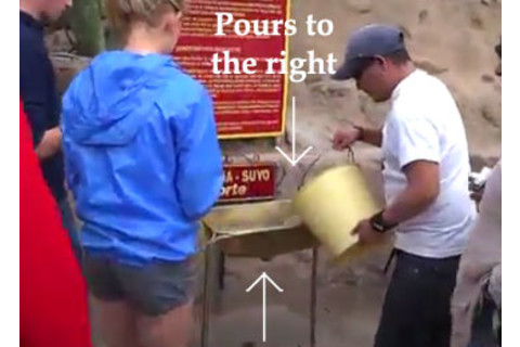 He then grabs the basin and bucket and moves a few meters south. Watch very carefully what happens then: he pours the water from a bucket, making sure the water is flowing in to the left of the drain hole: