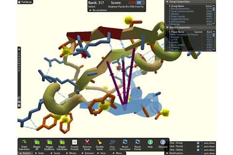 It’s not every day that people can get published in one of the world’s leading scientific journals by playing computer games, but Foldit is no ordinary game. The brainchild of Seth Cooper from the University of Washington, Foldit taps into the collective efforts of tens of thousands computer gamers to solve scientific problems. The goal of the game is to work out the complicated three-dimensional structures of different proteins. Proteins are feats of biological origami; they consist of long chains of amino acids that fold into very specific and complicated shapes. These shapes can reveal how proteins work but solving them is fiendishly challenging. To do it, scientists typically need to grow crystals of purified protein before bouncing X-rays off them. Foldit takes a different approach, using the collective efforts of causal gamers to do the hard work. And its best players can outperform software designed to do the same job. Best of all, you don’t need a PhD to play Foldit, or any scientific training at all. The controls are intuitive, tutorial levels introduce the game's mechanics, colourful visuals provide hints, and the interface is explained in simple language. While protein scientists concern themselves with “rotating alpha-helices” and “fixing degrees of freedom”, Foldit players simply ‘tweak’, ‘freeze’, ‘wiggle’ and ‘shake’ their on-screen shapes. It’s telling that barely an eighth of the players work in science, and two-thirds of the top scorers have no biochemistry experience beyond high school. Foldit’s success relies on the fact that it doesn’t shallowly flirt with interactivity – it’s a true game. Cooper designed it to “attract the widest possible audience... and encourage prolonged engagement”. For a start, that meant making it competitive. Players are scored based on the stability of the structures they end up with and a leader board shows how they rank against other gamers. There’s also a social side – gamers can chat on online forums, work in groups to solve puzzles and share solutions on a wiki. Of course, there’s the thrill of contributing to genuine scientific research, but that motivates less than half of the community. The rest do it for the achievement, the social aspects and largely, because the game was fun and immersive. And just like real game development, everything was tuned according to feedback from the players. Tools were added and refined, the difficulty of the tutorials was tweaked to stop frustrated beginners from leaving, and puzzles were matched to the skills of the players. Foldit’s origins lie within Rosetta, a piece of software designed to solve protein structures by simulating and testing thousands of different folds. Rosetta is an example of ‘distributed computing’, where volunteers run the program on their home computers when they don’t need it. They effectively donate their computing power to speed up the laborious task of solving protein structures. But the volunteers wanted to use their biological computers - their brains - as well as their man-made ones. They suggested an interactive version of the programme and in May 2008, they got their wish with Foldit. To test the usefulness of the approach, Cooper challenged his gamers with ten puzzles – proteins whose structures were solved but weren’t on any public database. Even so, the Foldit players did themselves proud. They outperformed the original Rosetta software on five of the puzzles and matched it on three of them. And in the two cases where Rosetta actually beat the players, it still didn’t get anywhere near the right answer. The human gamers had many advantages that gave them the edge. The players used a far wider range of strategies than Rosetta does, and some specialise in the early, middle or late stages of the game. And they were also good at working out where to begin. In one game, when they were given ten possible starting structures, they picked the one that was closest to the actual answer. Armed with the same starting set, Rosetta couldn’t do as well. The humans also had the massive advantage of long-term planning. Rosetta uses a “rebuild and refine” method to gradually arrive at the most stable structure through tiny tweaks. But it won’t investigate a potentially interesting move if it means making the protein temporarily less stable. The gamers had no such problems. They were quite happy to substantially unravel the protein because they knew that they could put it back together in an even better state. “Computers are obviously superior in the ability to crunch numbers, but lack the intuitive sense of knowing when to crunch numbers, or which tool to best use at a certain point in the game,” says CharlieFortsConscience, one of Foldit’s gamers. “The experience and intuition part of the gameplay, for me, is being able to look fresh at a puzzle structure and note which areas 'don’t look right'.” But even experience and intuition has its limits. Some puzzles proved too much for them. While some could solve the hardest of challenges – folding a full protein from its extended chain of amino acids – most struggled. Cooper thinks that he’ll get the best outcomes by blending the best of both human creativity and computer power. If Rosetta can take them half-way, gamers can finish the job with aplomb. Cooper was so impressed with the players’ strategies that he thinks he can use them to design better algorithms for later versions of Rosetta. As he says, “Our results indicate that scientific advancement is possible if even a small fraction of the energy that goes into playing computer games can be channelled into scientific discovery.” It’s a perfect example of what Clay Shirky describes as the “cognitive surplus” – the free time and mental energy that’s spent on leisure pursuits. Thanks to the Internet, this valuable resource could be channelled into something more productive. In the 
