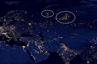 A nighttime view captured by the Suomi NPP satellite stretching from Western Europe at left to East Asia at right. In addition to the lights from cities, flaring gas in Siberian oil fields are clearly visible in the circled areas. (Source: NASA Earth Observatory/NOAA NGDC) As Russian forces have taken complete control of the Crimean Peninsula, little action to counter this violation of Ukraine's sovereignty seems forthcoming from the nations of the North Atlantic Treaty Organization. At least for now. As the Wall Street Journal reported yesterday: