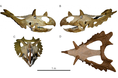Meanwhile, in Montana, Judith has gone legit. Specifically, the skull and partial skeleton of a fossil nicknamed after the Judith River formation, where they were found a decade ago, were formally described today, also in PLOS ONE. Unlike other ceratopsians, horns above this dinosaur's eyes sprout sideways, and bony hooks along the edge of its frill go every which way.