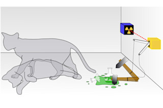 Schrödinger proposed an experiment where a cat would be put in box containing a vial of poison gas. A hammer would be suspended ready to smash down on the vial if triggered by the decay of a single atom of radioactive material. If no one looked inside the box, Schrödinger said, the radioactive atom would be in a superposition — both intact and decayed — and therefore the cat would exist in two states as well, being simultaneously alive and dead.