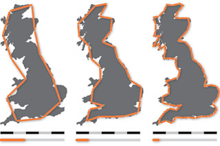 The thing that puzzled him was that the length of the measuring stick mattered. Let’s use Great Britain as an example: Use a 100-mile ruler, and you get one answer for total coastline. But if you reduce that ruler to a mile, it will fit inside bays the larger ruler missed, and the answer will be far larger. An inch-long ruler will give a still-larger result.