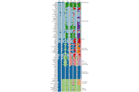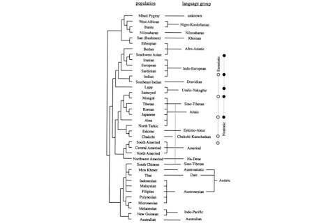 Genetic variation and languages are both characteristics of individuals & populations. One might imagine that gene flow between groups might be modulated by linguistic affinity between groups, or, linguistic affinity between groups might be modulated by gene flow between the groups. Cavalli-Sforza's colleague Marcus Feldman has asserted that the correlation does indeed emerge out of biases in mating patterns more explicitly of late. Language and genes are passed from parents to offspring. But, there are clearly differences in terms of the specific constraints on inheritance. When it comes to genes we have both the Mendelian abstraction as well as DNA as a concrete substrate. Parent-offspring transmission is symmetrical (from both parents), subject to mutation, segregation, recombination, etc. Though there are attempts to model language, to my knowledge there is not such robust theoretical understanding of the inheritance of language from parents to offspring, in particular the biological substrate which acquires language (I do not class the arguments about deep structure in linguistics in the same class as Mendelian and DNA models of genetics). Of course there is the reality of great differences in transmission of language and genes. In the domain of language horizontal transmission is critical to understanding its distribution & evolution (I am aware that horizontal gene transfer is important in biological evolution, but not so much in the scope and species we're talking about). One's parents may speak a different language because language acquisition and fluency is also dependent on peers in a way that genetic variation is not. Additionally, language transmission from parents need not be symmetrical, one may acquire the language of one parent but not the other. One may speak the same language as one's parents, but with a different accent (that one of one's peer group). Interestingly, the exception to this rule of accents are individuals with some socialization dysfunction, such as autism. There are also similarities between languages and genes. The molecular clock has its analogy in the lexical clock. There is also lexical admixture between languages, for example the heavy load of French-derived terms in modern English, the influence of Slavic upon the Baltic languages. A new paper in PLoS Biology leans on these last similarities to utilize the Structure framework to flesh out the relationships of the language of New Guinea & Australia, what was once "Sahul" during the last Ice Age. The author's summary from Explaining the Linguistic Diversity of Sahul Using Population Models:
