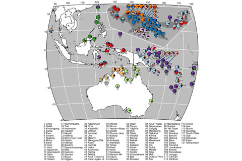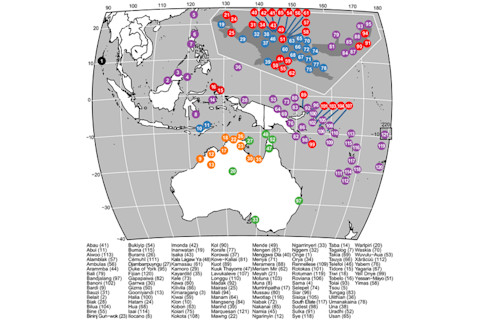 The current consensus seems to be that the modern populations of New Guinea & Australia are descended from the original "Out of Africa" migration which occurred ~50,000 years ago (in particular, the "Southern Route" which swept along the northern fringe of the Indian Ocean). I don't think this should be taken to be the last word though, we know that the dingo arrived from Southeast Asia within the last 10,000 years, so there was always contact between Australia and the islands to the north & west. Though the dingo mtDNA seems to coalesce into one recent lineage, implying one founding event, which is curiously analogous to the dominant model of Australian settlement. In any case, the results of this paper is where the action is, so I'll just show you the figures. Here is a map, with colors illustrating the putative language families: