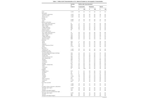 Among these medical students, 5% self-characterized as politically very conservative, 21% conservative, 33% moderate, 31% liberal, and 9% as very liberal." Being male, white, Protestant, intending to specialize in Surgery or anesthesiology/pathology/radiology, or currently or previously being married significantly... increased the likelihood that a student self-identified as very conservative or conservative. Disagreement or strong disagreement with the statements, "I'm glad I chose to become a physician" and "Access to care is a fundamental human right," were also both associated with being very conservative or conservative. Being more liberal was reported by blacks and Hispanics; those intending to become ob-gyns, psychiatrists, and pediatric subspecialists; and atheists, Jews, and adherents of eastern religions.