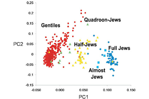 One of the most popular posts on this weblog focuses on the differences between Ashkenazi Jews and gentiles, in particular peoples of European descent. The figure to the left illustrates that white Americans who are gentile or Jewish are rather easy to distinguish genetically from each other. That Jews exhibit a particularly distinctive genetic signature may not be all that surprising, considering that medical geneticists have long known that there are diseases which are biologically rooted and heavily overrepresented among this population. Distinctive traits imply distinctive genes. And the demographic history of the Jewish people as attested to in the literary records can be fitted rather easily within the framework of many of the results coming out of the genetic studies.