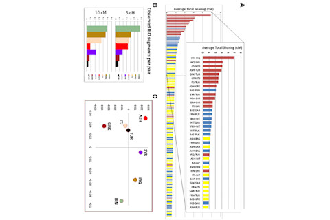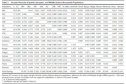 Figure 3 of this paper summarizes the main IBD results. In panel A the red bars are Jewish-Jewish comparisons, yellow Jewish-non-Jewish, and blue non-Jewish-non-Jewish. Panel C plots the genetic relationships adduced from the IBD results on a 2-D plane.