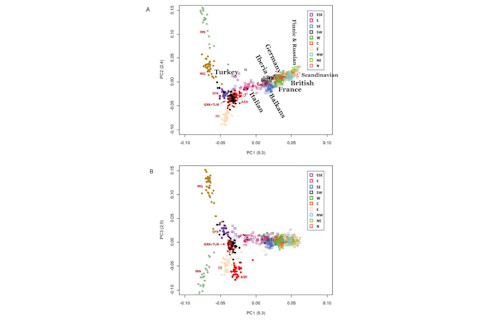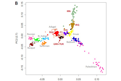 These findings demonstrated that the most distant and differentiated of the Jewish populations were Iranian Jews followed by Iraqi Jews (average FST to all other Jewish populations 0.016 and 0.011, respectively). The closest genetic distance was between Greek and Turkish Sephardic Jews (FST = 0.001) who, in turn, were close to Italian, Syrian, and Ashkenazi Jews. Thus, two major groups were identifiable that could be characterized as Middle Eastern Jews and European/Syrian Jews, an observation that was supported by pairwise FST and by phylogenetic tree analysis….