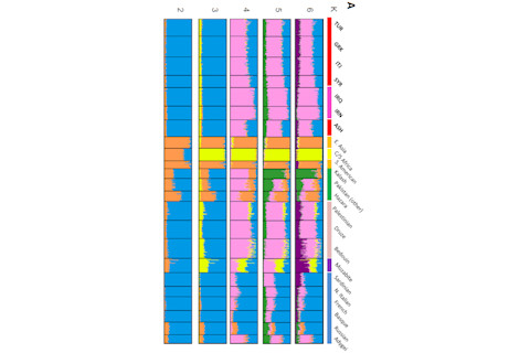 Another way to look at the variation is through Structure, where there are K ancestral groups, and individual genomes are conceived of as a synthesis of K groups.