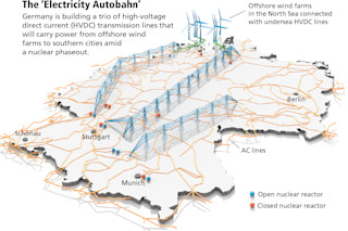 With the last German reactor scheduled to close down in 2022, the south, which has depended on nuclear reactors for nearly half its electricity, desperately needs that power. It stands to benefit greatly from the next phase in the Energiewende, which involves building an “Electricity Autobahn” — a trio of high-voltage direct current transmission lines (HVDC) spanning 2,000 miles to carry huge amounts of electricity from offshore wind farms in the North Sea down to the heart of Germany’s manufacturing region.