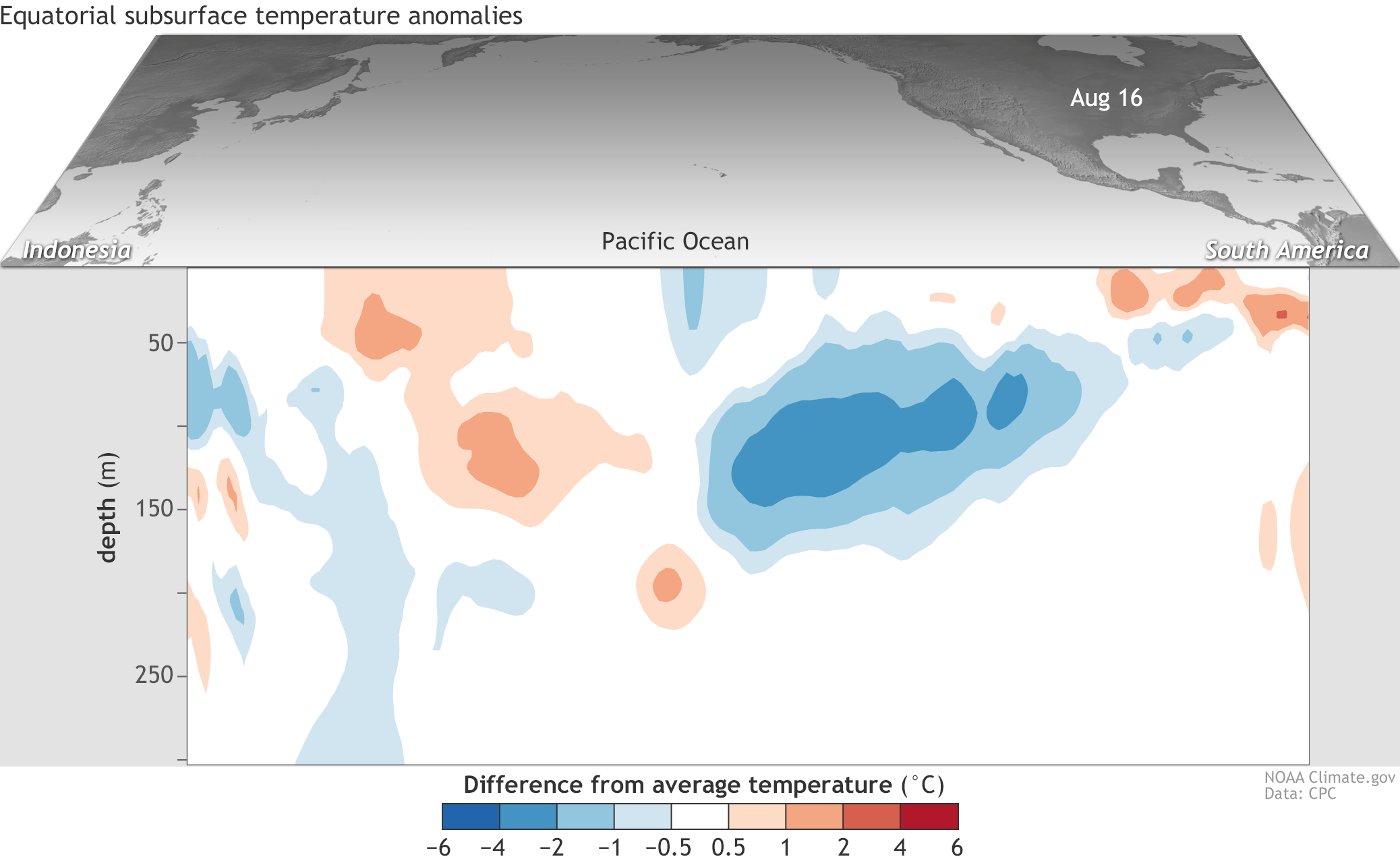 Here's how La Niña tends to influence weather patterns across North America. (Source: NOAA) But it's important to note that with La Niña (or its opposite, El Niño, for that matter), YMV. For example, last winter, despite the presence of La Niña, incredibly heavy precipitation drenched large parts of California. This was thanks to another phenomenon, known as the "pineapple express". A number of factors have climatologists convinced that La Niña is brewing again. Among them are changes to Pacific Ocean trade winds. These ordinarily blow from east to west across the equatorial Pacific, helping to bottle up warm surface waters in the western part of the ocean basin. As a La Niña episode gets going, those winds tend to strengthen, shoving even harder on warm surface waters, pushing them out of the way, and thereby allowing cooler water to well up from the ocean depths. This is precisely what began to happen during August. At about 160 to 500 feet beneath the surface of the Pacific, a blob of cooler-than-average water formed and began rising and spreading to the east along the equator. You can see this blob, called a "kelvin wave," in the animation at the top of this story. The visualization depicts a cross-section of the Pacific Ocean along the equator, and it shows the evolution of the cold blob starting in early August. This shift in conditions in the Pacific had its origins even prior to August. "During the second half of July, the trade winds puffed a bit harder over the western half of the Pacific, likely helping this current Kelvin wave form," writes Emily Becker in NOAA's informative and compellingly clear ENSO Blog. Parts of the blob reached the surface in August, resulting in anomalously cool surface waters along the equator. This is characteristic of La Niña. But it's important to note that this and other features have to strengthen and persist before NOAA will declare the official start of a La Niña episode.