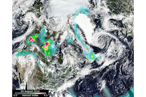 A map of smoke over North America on Aug. 4, based on data from the Ozone Mapping Profiler Suite (OMPS) on the Suomi NPP satellite. (Source: NASA OMPS blog) The same rising air currents that cause pyrocumulus clouds to form can also propel smoke particles high into the atmosphere. From there, winds can carry these particles far afield. The image above, from the Ozone Mapping Profiler Suite, or OMPS, on the Suomi NPP satellite, maps the spread of smoke on August 4th across a large portion of North America from the fires in California and Oregon, as well as wildfires still blazing in Canada.