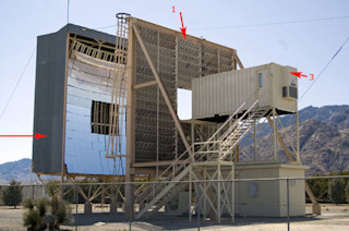 The furnace’s heliostat, a 40-foot-wide panel of 36 mirrors (not visible here), tracks the sun across the sky, reflecting light into the attenuator (1), a grate that can be opened or closed like a window blind. Sunlight that makes it through falls onto the concentrator (2), a concave panel of 180 mirrors that focuses the light into a beam and sends it into a 16-foot-long test chamber (3). There, researchers use an adjustable shutter to control how long objects are exposed to the beam. The furnace can reach temperatures of up to 5,000 degrees Fahrenheit.