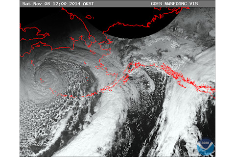 A GOES satellite captured this image of the massive storm swirling in the Bering Sea near the western Aleutian Islands on Nov. 8, 2014. (Source: National Weather Service) The central part of the storm alone is about as big as the entire state of Alaska. Fishing boats featured on the Discovery Channel's Deadliest Catch program were reported to be riding out the storm. “We have from three to five boats in the water in full production right now,” Deadliest Catch executive producer David Pritikin is quoted as saying by Discovery News. “Some are racing back to Dutch Harbor, others will be out there fishing through it. They won’t be able to make it back in time, and they have the quota to catch.” For more details about the storm, including an excellent explanation of how it is expected to help trigger an outbreak of frigid temperatures across the U.S. midsection next week, see Andrew Freedman's story at Mashable.