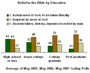 My twoposts on religion & IQ/education are getting a lot of attention. I didn't spend more than 30 minutes on both entries combined, so the attention to unit time invested ratio is rather out of wack. Doing some digging it's funny how interested people are in this topic, while at the same time being totally disinclined to do their own leg work. Multiple message boards have also pointed to another similar survey which shows the relationship between religiosity and IQs in international comparisons. You might be amused to find out that I wrote that up in 30 minutes 5 years ago as a joke! All the data is real, I didn't make it up, but in all honesty I connect these particular dots to see peoples' prejudices slam up against their anti-prejudices. Most atheists are Good Enlightened people who are often skeptical of IQ tests because Good Enlightened people know that standardized tests are false (except of course in the cases where they make sure everyone knows their really high standardized test score while at the same time admitting that it "doesn't mean anything...."). But atheists also generally believe that religious people, especially fundamentalists, are stupid and lacking in reasoning capabilities. So how about pointing out that religious fundamentalists don't do as well on tests which supposedly measure reasoning ability? If you track some of the reaction on the message boards you see repeated instances of excitement and glee before someone pipes up to remind the assembled godless that "IQ isn't a valid measure of intelligence." Gosh darnit! For the record, I believe IQ and standardized tests in general have predictive power. I also don't believe in God. In any case, a few people have questioned the relationship between education & Biblical literalism. I've pointed out that that's a pretty robust trend over many decades, but I'll offer some quick "proof." Then I'll repost some data I found in regards to elites and their religious affiliations and views which might interest. So, One-Third of Americans Believe the Bible is Literally True, High inverse correlation between education and belief in a literal Bible: