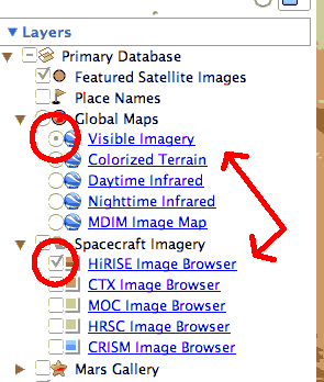 Almost there. In the left sidebar is a menu called Layers. In there is a heading called Spacecraft Imagery. Click the little triangle, then click the button next to HiRISE Image Browser. That turns on the layer giving you images from the HiRISE camera. Right above Spacecraft Imagery is Global Maps. Click the triangle, then click in the circle next to Visible Imagery. That's it! Now double click the KML file you downloaded (by the way, you have to have Mars open before you open the KMZ file or else this won't work at all). When you do, you'll hear my dulcet but mildly goofy tones, taking you on a brief tour of Mars. Just sit back and let Google do the work for you. The whole thing is less than two minutes, and at the end I get a little conspiratorial. This whole package has obvious educational benefits; you can now show people what you want them to see, in the order you want them to see it, and even with your own narration! This works for Earth and for Sky as well. I can see this being used a lot in the classroom. Google Earth/Sky/Mars is so much fun. You can bookmark places, save them, send them to other people, and a lot more. This is an incredible tool, and it's lots of fun to play. So go! Explore Mars!
