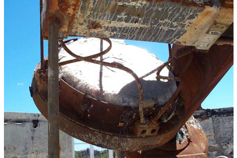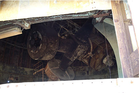 And then we went to the 50 inch. I knew this telescope. I had never used it, but I have friends who had, and I'd seen pictures of it in happier days. How many papers on the MACHO project had I read, observations done on this grand old lady? But not any more. The telescope, like many big instruments, was an open truss structure. Steel pipes had held the mirror in place, but the fire had softened them, and the whole thing had swung down. Bizarrely, the mirror hadn't melted: the glass had shattered in place. We walked right up to it, and we could still see that it held a parabolic shape, but instead of one piece of glass, it was now several thousand, like someone had taken a hammer to it.