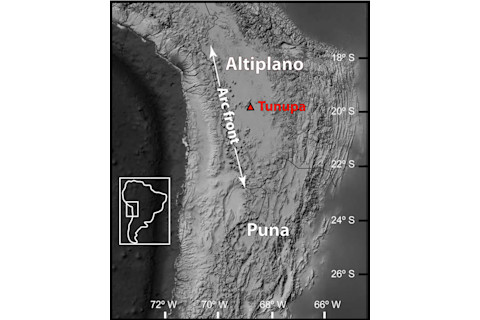Location map of Altiplano-Puna plateau of the central Andes. Volcán Tunupa is a composite cone located east of the arc front near the center of the Altiplano basin in Bolivia. Click here to see larger version.
