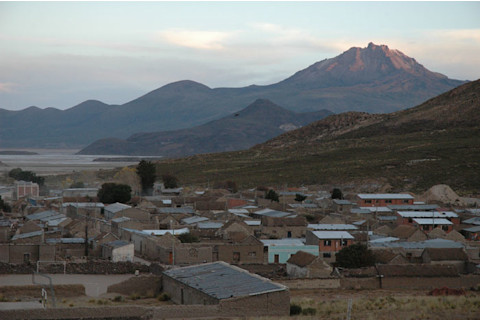 Volcán Tunupa from the north. The town of Salinas de García Mendoza is in the foreground. Click here to see a larger version.