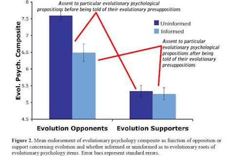 A reader reminded me of an amusing paper, Who Likes Evolution? Dissociation Of Human Evolution Versus Evolutionary Psychology. The gist of the results are below (I added some clarification):