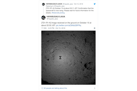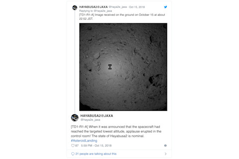 Minutes after this photo was taken, Hayabusa2 reached its targeted lowest altitude, and “applause erupted in the control room!” the official account tweeted.
