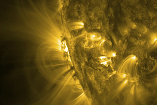 An image of the sun's surface captured in March by NASA's Solar Dynamics Observatory. (Image: NASA Goddard Space Flight Center) It never ceases to amaze me that we have instruments capable of showing us what it's like on the surface of the sun. The Solar Dynamics Observatory is one of them, and in March, it returned a series of images that NASA has made into a spectacular movie. Click on the image above to see the full animation. The sun is made mostly of plasma — a soup of electrons, as well as atoms that have lost their electrons, laced with magnetic fields. In this image, and the animation as well, the presence of magnetic fields is visible in the form of gigantic loops leaping and reconnecting with the surface of the sun. Plasma is cooler, and therefore darker. The Solar Dynamics Observatory, launched on Feb. 11, 2010, is designed to help scientists gain a better understanding of how the Sun influences the Earth and its nearby space environment. It focuses on the atmosphere of the sun, called the corona. Right now the sun is relatively quiescent. In late March and early April, there were some glimmers of increased activity, with a few flares and ejections of material from the corona. But in the last few days the sun has pretty much been napping, with very little activity. One forecast calls for relatively low activity through late April.