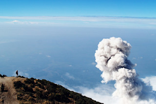 In general, you can estimate plume height with an equation that relies on knowing something about the energy released during the explosion. If the eruption is a discrete explosion (rather than constant input of new magma), the height of the plume can be estimated as HT (height of the plume) = 1.37Q1/4, where Q is the energy released in joules. The relationship is a fractional exponent, so the plume height gets taller but at a declining rate, limiting the potential height of the plume even as you add more energy. You can get at that estimate of energy by looking at the eruption rate—how much stuff is coming out per second. The plumes from the recent explosions at Santiaguito have reached over 7 kilometers (20,000 feet) above sea level.