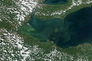 An algae bloom in the western part of Lake Erie just offshore of Toledo, Ohio is visible in this image captured today (Aug. 3) by NASA's Terra satellite. Do you see it? The green slime at the western end of Lake Erie in the satellite image above? That could be the source of the toxins that have caused the city of Toledo, Ohio to impose a drinking water ban affecting 500,000 people. The ban continued today, as further testing revealed evidence of the toxin microcystin in a drinking water plant. Microcystin is produced by blooms of cyanobacteria, also known as blue-green algae. In the image from NASA's Terra satellite above, a widespread bloom is evident; whether it contains the the cyanobacteria that produce microcystin I can't say for sure. But I'd put money on it. I didn't want to say this in the headline, because I didn't want to seem sensationalistic: Mycrocystin-LR, which is commonly produced by cyanobacteria blooms, is actually more toxic than sodium cyanide. So no wonder Toledo imposed the drinking water ban! According to an "urgent water notice" from the city: