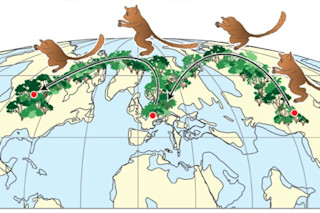 As I browsed the new papers published this week in the Proceedings of the National Academy of Sciences, I was brought up short by this frolicsome picture. It's a nice example of the visual display of information done right. It shows the spread of primates 55 million years ago across the Northern Hemisphere. I'm always game to learn about what primates were up to in Wyoming and Greenland. But this picture--and the paper that goes with it--have an extra value. They offer some clues to what sort of world we may be creating by pumping billions of tons of carbon dioxide into the atmosphere. Paleontologists have known for a long time that something remarkable happened around the time the Paleocene period ended and the Eocene began, about 55 million years ago. The oldest fossils of many groups of mammals appear for the first time around then, including hoofed mammals, whales, bats, and primates. Mammals also made tracks, spreading to continents where, at least according to the fossil record, they had not lived before. At the same time, the world saw a rise in extinction rates, particularly among some single-celled deep sea organisms. Geologists have also found much to ponder from this moment in history. Rocks from the end of the Paleocene contain peculiar levels of isotopes of carbon and other elements, pointing to a dramatic change in the planet's global chemistry. Scientists now estimate that somewhere between 1500 and 4500 billion metric tonnes of carbon was released into the atmosphere and oceans over several thousand years. Scientists are debating exactly where all that carbon came from. Some argue that buried methane deposits came belching out of the sea floor. Other possibilities include a sudden rise in fires. However this carbon turned up, it changed the world. The atmosphere warmed by an estimated five to nine degrees C. Formerly dry regions turned muggy. The oceans warmed as well, and its circulation shifted. As carbon dioxide dissolved into the oceans, they turned acidic. After the carbon was initially released 55 million years ago, the planet continued to warm, acidify, and otherwise change for the next 75,000 to 90,000 years. It then took another 70,000 years to recover to something akin to its previous state. (A quick, free, up-to-date summary of the evidence was published this year in the journal Eos: pdf.) In recent years, paleontologists and geologists have been getting together to pool their results, with some striking results. Geologists have put precise dates on the shifts in carbon levels and other chemical changes at the end of the Paleocene. Paleontologists can identify those shifts in the rocks in which they find fossils. This knowledge lets them narrow the ages of some fossils down to intervals of a few thousand years. History makes more sense with better resolution. To say that Napoleon and Charlemagne lived within 1000 years of each other isn't saying much at all. In the paper from which this figure comes, a team of paleontologists looked at the timing of primate evolution around the heat spike. Until now it hasn't been clear exactly when primates first expanded their territories, nor has it been clear which path they took--where they originated, and where they moved to. They focused their attention to six species belonging to one genus, Teilhardina. Teilhardina is the oldest primate from Europe and Asia, and it is tied for oldest with another primate in North America. It is also the oldest "true" primate (euprimate), sharing many of the features that set living primates off from extinct relatives and ancestors. Its fossils indicate that it was a small tarsier-like primate that searched for food during the day, living exclusively in trees. The scientists found that fossils of Teilhardina from Asia are the oldest, followed by fossils in Europe, finally followed by fossils in North America. A nice bit of congruence emerged when they drew an evolutionary tree of the Teilhardina species along with a couple other early primates. The paleontologists found that the Asian species had the deepest branch, and that the European and North American species shared a more recent common ancestor. The new dating on the fossils indicates that this spread from Asia to Europe and North America took less than 25,000 years, right as the carbon levels were soaring. One must always take these results with a grain of salt, because paleontologists can never say for sure that they've found the oldest fossil of any species. However, they can be relatively confident when the rocks from the age they're interested in are loaded with fossils. And that just so happens to be the case for primates 55 million years ago. As this picture suggests, it now appears that primates (or at least primates like Teilhardina) originated in Asia and moved to Europe. They then moved from Europe into Greenland and then into North America. The paleontologists suggest that a number of mammals may have taken the same path to North America (rather than going over the Bering Land bridge, as has been suggested in the past). Ocean levels dropped around 55 million years ago, and so the primates and other mammals may have been able to move over land bridges between the continents. Teilhardina's particular way of life also implies that this journey had to have passed through a continuous belt of lush forests. Greenland would have had to have been very green indeed for primates to pass through it. The warm, humid climate would have suited such forests well. It just so happens that paleobotanists have been looking at what happened to plants 55 million years ago, and they've documented a swift spread of tropical trees northwards through North America over 10,000 years. So it appears that global warming laid down the path for the primates, and they raced along it. The journey of Teilhardina is one we would do well to consider. We are now injecting carbon dioxide into the atmosphere at about the same rate at which it was released 55