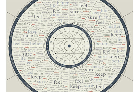 The wonderful website Information is Beautiful does terrific work taking interesting data and turning into easy-to-grasp information. They recently turned their attention to astrology -- guess why -- and did something truly cool: made a word cloud of the most commonly used terms in horoscopes. The sample was pretty big, comprising 22,000 horoscopes taken from Yahoo (which itself got them from astrology.com). Here's what they found: