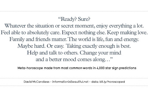 Heh. Note that the common words appear over and over again in all the horoscopes despite the sign. Feel, keep, life, sure, energy, better, and of course love... you see these in all the signs. Why, it's almost as if the signs make no difference! And what I found more interesting is what you don't see: words with significantly different descriptive power. If different signs tend to describe different personalities, why don't I see unique words like angry, powerful, extroverted, introverted, and so on? They scraped the most commonly used unique words for every sign, and they're really not very predictive (scroll down to the Word Analysis 2 section on the Information Is Beautiful page to see). Again, it's almost as if astrology isn't really terribly descriptive of different people. Whenever I write about astrology, I get comments from astrologers (and believers) who say that the type of astrology I'm describing is wrong, but their type, of course, is accurate. But these horoscopes were supplied by astrology.com, which claims to describe various types of astrology. Of course, this is also the website that features "Heather the Cosmos Gal" who wrote about the recent sign mix-up, "...try not to worry too much right now about what scientists are saying." Hmph. She also mentioned that we get our zodiac signs from the Greeks, not the Babylonians; however, even if true it doesn't change anything! The constellations have still drifted since that time, and the problem with star sign astrology remains. Well, all the problems still remain. By the way, if she looks familiar, it may be because she's the same one who achieved internet infamy a couple of years back when she was filming the daily horoscope but somehow didn't manage to predict an earthquake hitting while she was on camera! You'd think her horoscope might've predicted that. Now, I suppose you could argue that by collating so many different horoscopes cast for so many different types of people it's not surprising the predictive power, if any, were diminished. But the folks at Information Is Beautiful took the most common words and created a metahoroscope: