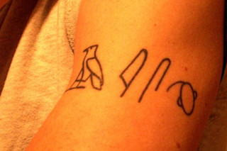 The attached image shows my second tattoo and the most directly science-themed ink (although the others are also peripherally linked to the career I love so dear). The four hieroglyphic characters are the earliest written form of the word "brain" and are found in the Edwin Smith Surgical Papyrus. Dating back to seventeenth century BC Egypt, the papyrus is perhaps the first neurological case study describing the symptoms of head injuries and the odd fleshy matter that was often visible in the most gruesome of head wounds. These symbols and the story of the papyrus are the opening to the classic textbook "Principles of Neuroscience", which I first came across when taking an undergraduate course in 2000. In honor of starting my graduate research career in studying the brain, I got this tattoo while attending a neuroscience conference in NYC in 2002.