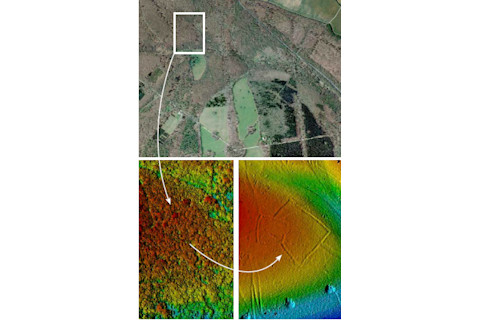 Three views of a site in England’s Savernake Forest demonstrate satellite imagery’s shortcomings (top). A LIDAR image (bottom left) shows fine gradations in elevation and, after processed to remove vegetation, reveals Iron Age construction (bottom right). From top: Infoterra Ltd. and Bluesky/Getmapping PLC/Google Earthh; English Heritage/Cambridge University Unit for Landscape Modelling (2)