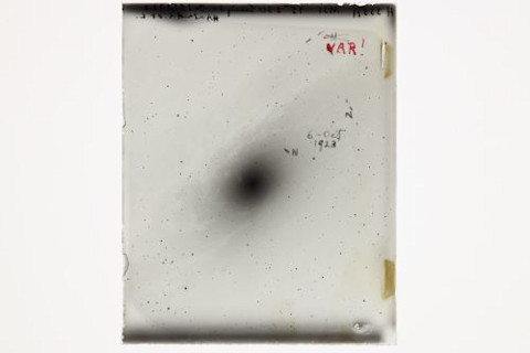Astronomer Edwin Hubble made an exposure of the “Andromeda Nebula” with the Hooker Telescope at Mount Wilson Observatory near Los Angeles on Oct. 5, 1923. He was initially excited, believing he had recorded a nova, an exploding star. He marked the star, which lies between two tick marks he drew at the top right on the plate, with the letter N. The star turned out to be a Cepheid variable, and Hubble used it to prove that the distance to the Andromeda Galaxy was far greater than astronomers thought. (Credit: Courtesy of the Carnegie Observatories/Cindy Hunt)