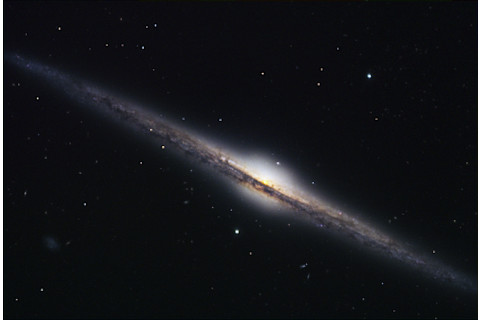 NGC 4565 in Coma Berenices is the brightest and most prominent galaxy in our sky that is oriented perfectly edge-on to our line of sight. We see its disk as a thin, silvery needle. Some 57 million light-years off, it lies in the Virgo Cluster and has a prominent central bulge, suggesting it may be a barred spiral. (Credit: Adam Block)